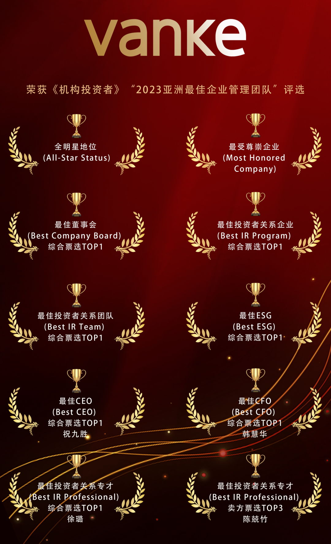 近日,国际知名金融杂志《机构投资者》(Institutional Investor)公布“2023亚洲(日本除外)最佳企业管理团队”榜单,万科凭借公司出色的信息披露表现、ESG表现以及投资者关系管理表现,获得众多买方与卖方机构的支持,荣幸被票选为房地产(含REITs)行业板块核心亚洲及中国大陆双榜单唯一最受尊崇企业(Most Honored Company),同时在六项分类榜单中均获行业综合票选第一名,获得全明星地位(All-Star Status)。