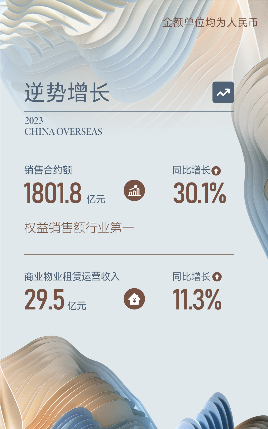 8月28日,中海地产官微发布中国海外发展2023年中期业绩。其逆势增长销售1801亿元,同比增30%,权益销售额排名第一。