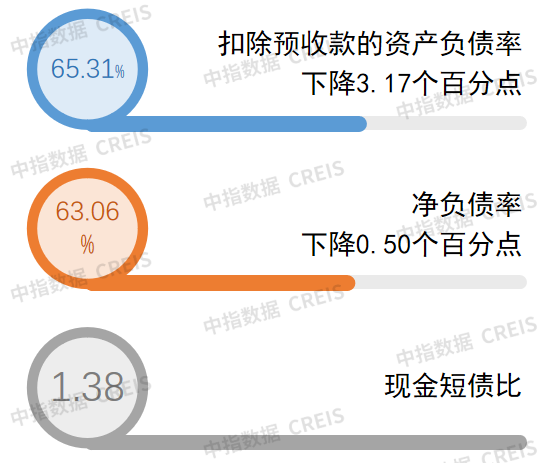 优化资产负债结构,“三道红线”持续保持绿档水平。保利发展坚持稳健的财务管理政策,不断夯实资产,强化风险防范和应对能力。截至2023年6月30日,保利发展货币资金余额1486亿元,保持在总资产10%左右的合理水平。有息负债规模3564亿元,较期初减少250亿元。公司资产负债率76.99%,较年初下降1.12个百分点;扣除预收款的资产负债率为65.31%、净负债率为63.06%,分别下降3.17和0.50个百分点,现金短债比为1.38,“三道红线”持续保持绿档水平,以稳健的财务结构兼顾风险防范与规模扩张,保障公司穿越行业周期变化。